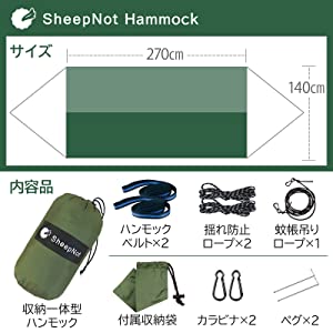 本体サイズ:270㎝×140㎝ハンモック生地:210Tパラシュート生地付属品:収納一体型ハンモック、ハンモックベルト×2、揺れ防止ロープ×2、蚊帳吊りロープ×1、付属品収納袋×1、カラビナ×2、ペグ×2