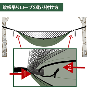 付属の蚊帳吊り用ロープを取り付けることで、蚊帳が顔にかかることなく利用していただけます。※説明書内において「蚊帳吊り用ロープ×2」と記載されておりますが正しくは「蚊帳吊り用ロープ×1」でございます