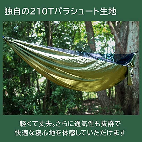 生地には弊社独自の210Tパラシュート生地を採用。軽くて丈夫。さらに通気性抜群で快適な寝心地を体感していただけます。肌触りも良いので半袖でも安心して過ごせます。展開した時の大きさは270㎝×140cm、耐荷重は「300㎏」を実現し大人二人でも余裕で利用可能。ソロはもちろん家族やパートナーと無重力のような寝心地を体験してください。