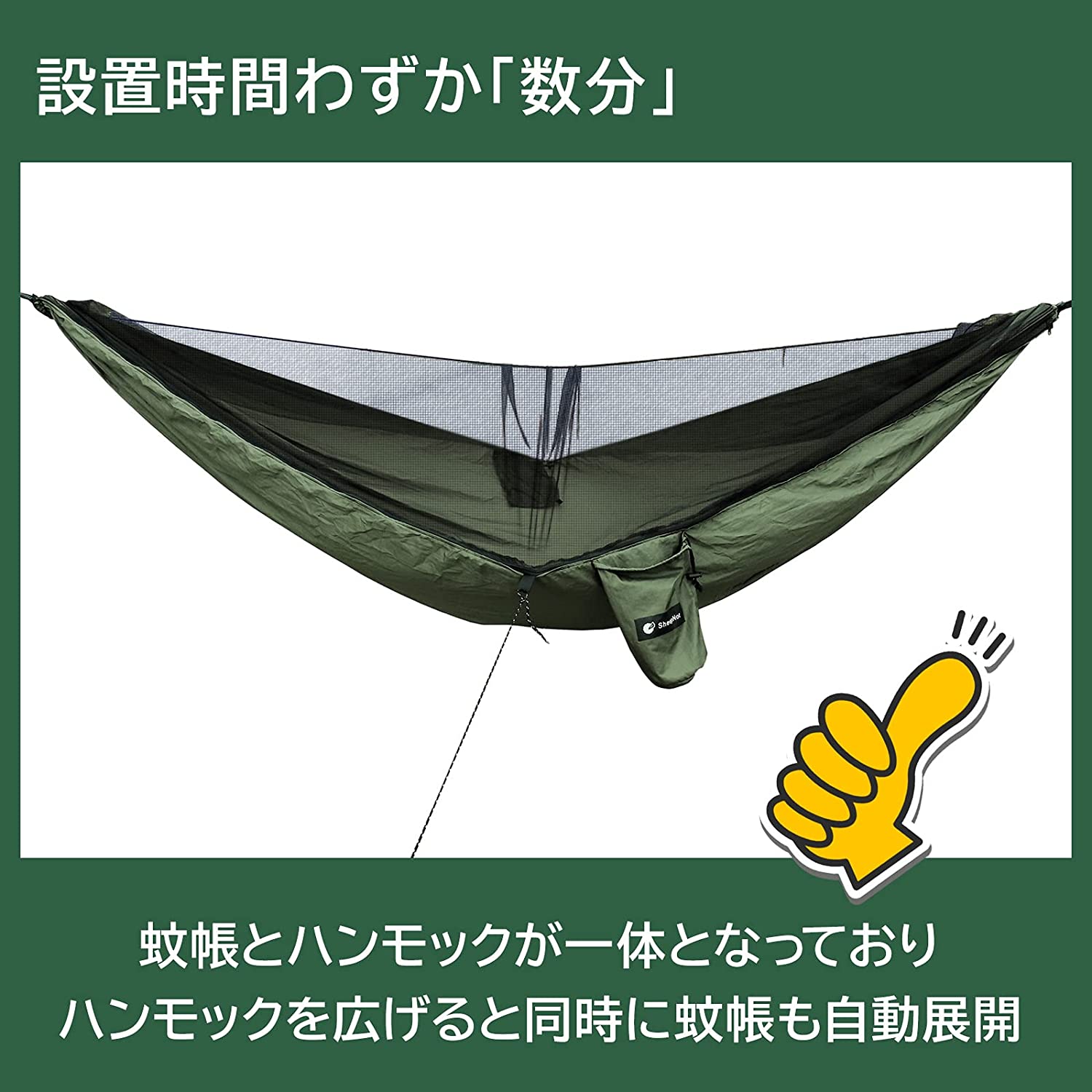 蚊帳とハンモックは一体となっており、ハンモックは広げるのと同時に自動的に展開します。山や林等3~4m程度の間隔で生えている木をみつければたった数分で虫を気にせずに最高の昼寝が出来るスペースを確保することが出来ます。ゆらゆらとまるで無重力のような寝心地を体感してください。