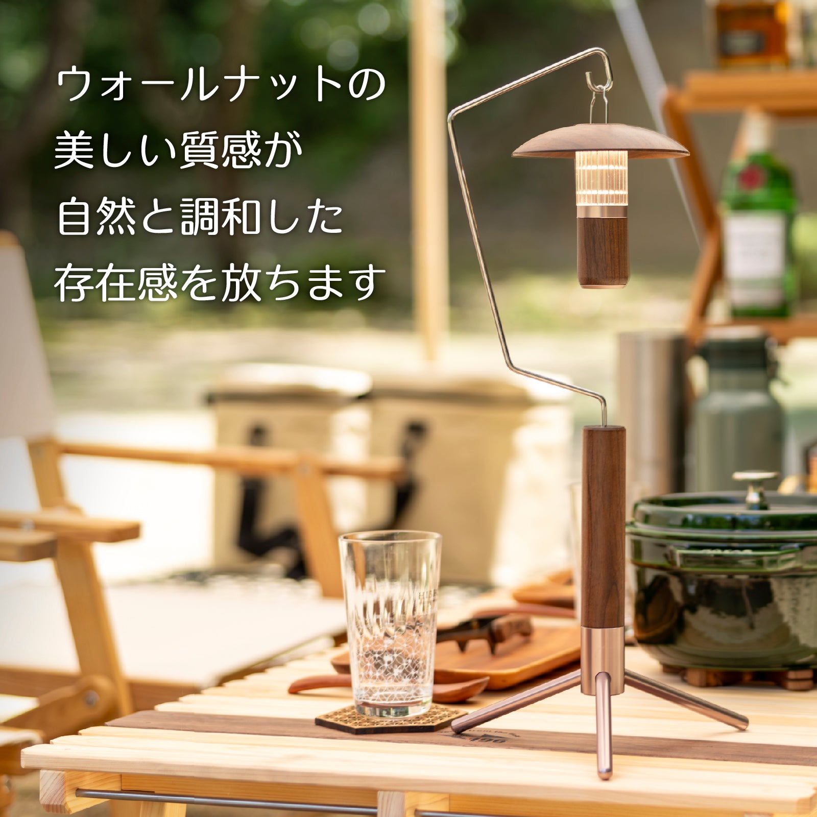 三脚式のランタンスタンドは、不安定な地面でもしっかりと設置することができます。クルミ材とピンクゴールドのアルミ素材が組み合わさったおしゃれなデザインで、インテリアにも合わせやすいスタンドです。高品質な素材と設計により、長く愛用できるアウトドアグッズとして、またインテリアとしてもおすすめ。