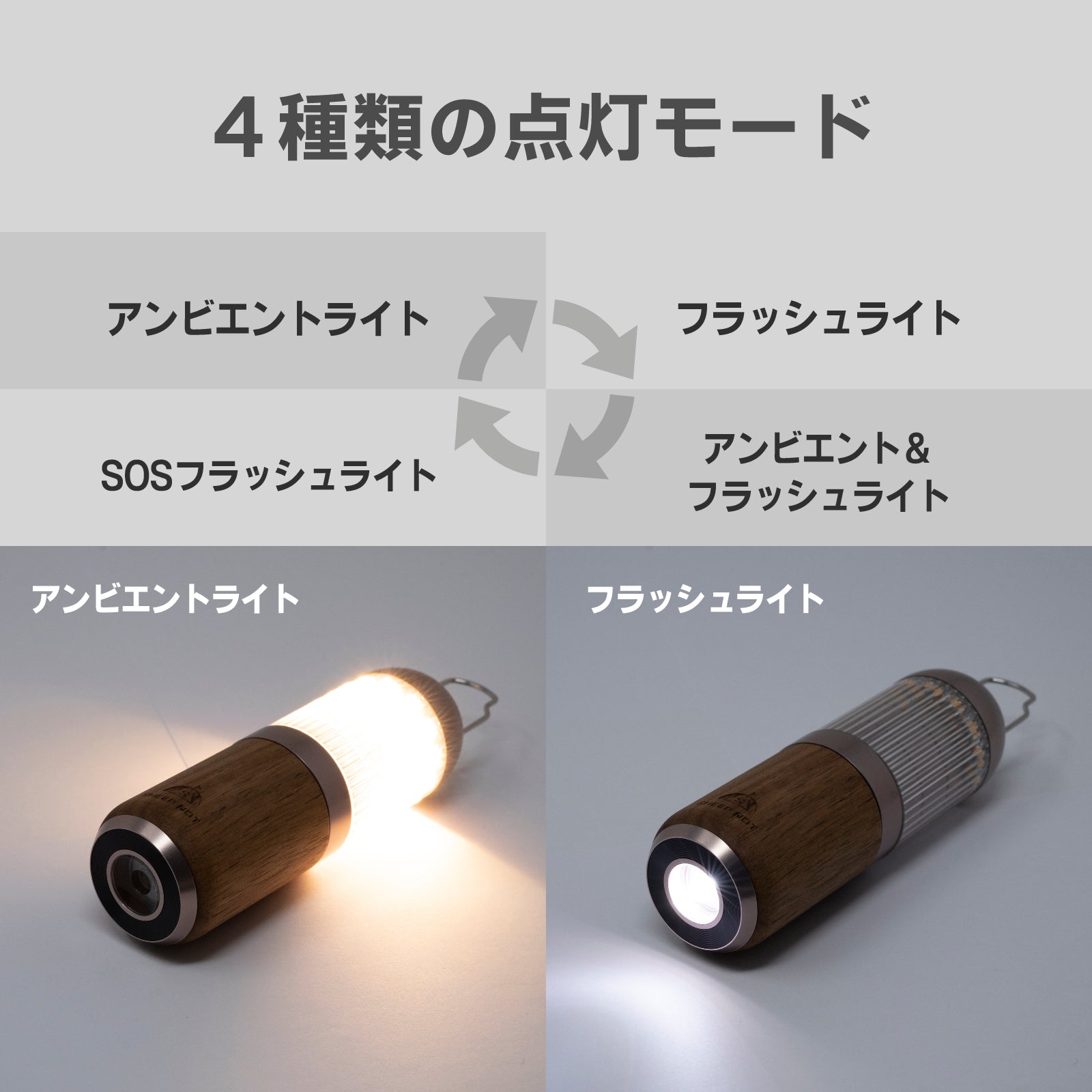 4つのモードを切り替えて、様々なシーンにマッチした光を放ちます。・アンビエントライトモード・フラッシュライトモード・アンビエント&フラッシュモード・SOSフラッシュライトモード